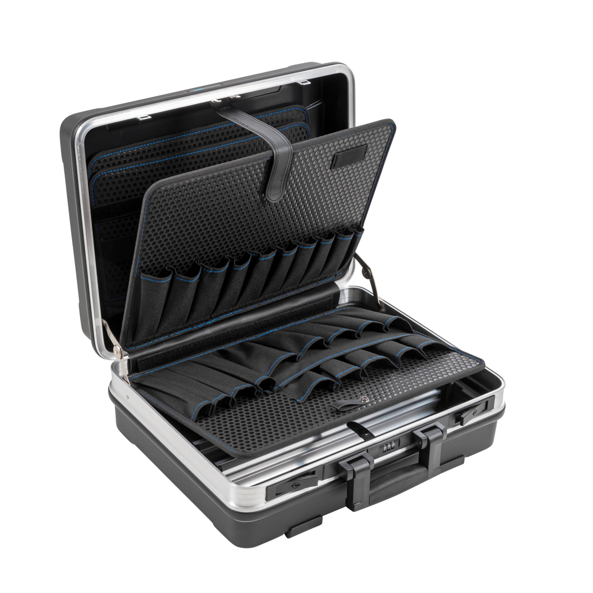 - Removable tool boards under lid and as cover for the main compartment with a total of 9 module tool holders distributed across the front and back of the boards