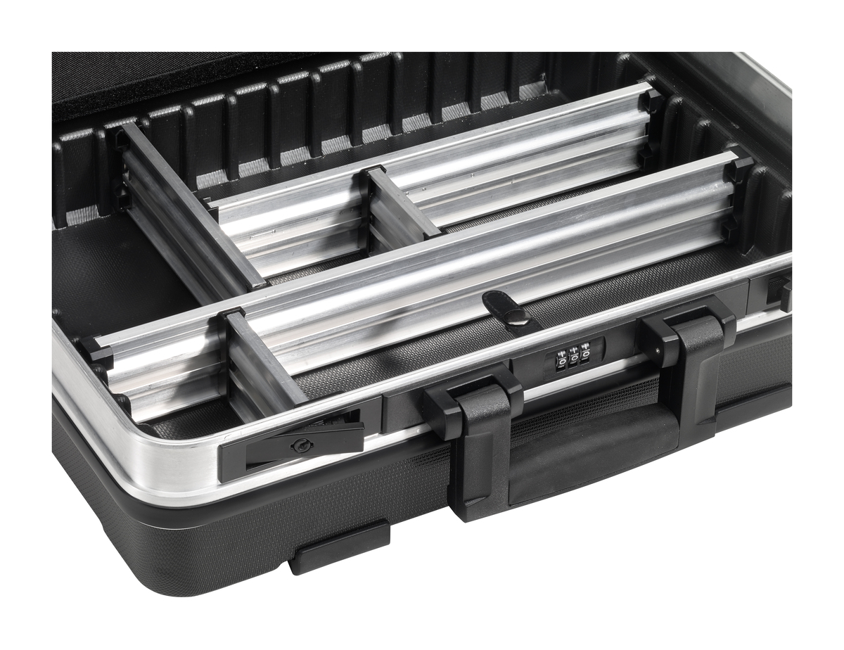 The sturdy ABS shells provide reliable protection for valuable tools. The 4 base feet prevent the case from rubbing on uneven surfaces, maintaining the case's modern design. In addition, the 2 sliding rails on the lower base rail prevent the base tray from being scratched. Security is provided by two lockable tilting latches and the B&W PROFIcode combination lock. These features allow the case to be securely locked at all times.