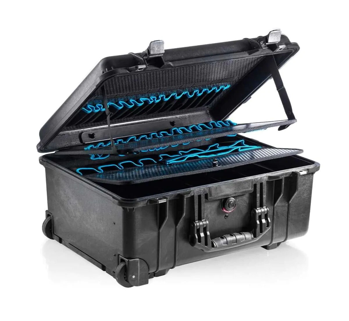 GUARDIQUE Peli 1560T is our own produced tool case based on a standard Peli Case 1560. In our Peli 1560T, we have fitted professional tool inserts, consisting of 2 single and 1 double tool inserts (all removable). Furthermore, there are strong adjustable dividers in the bottom, which can all be removed if you want one large compartment.