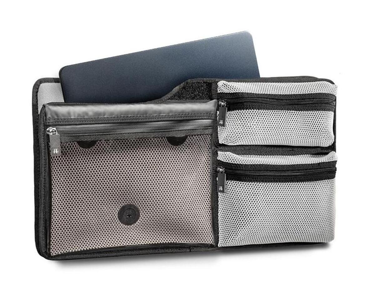 The organizer is completed by a removable pouch with shoulder strap, the latter's outer coating of Cristall Achilles® Superclear and the coated zip make it water-repellent.