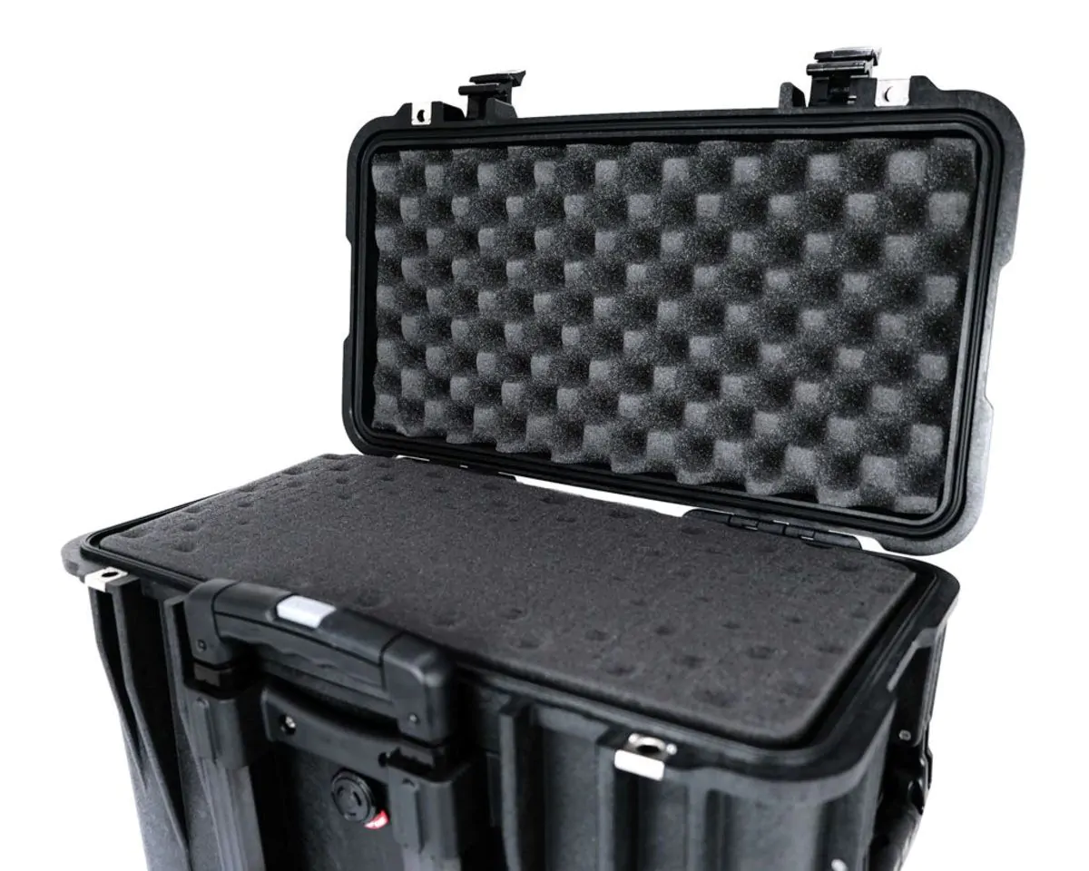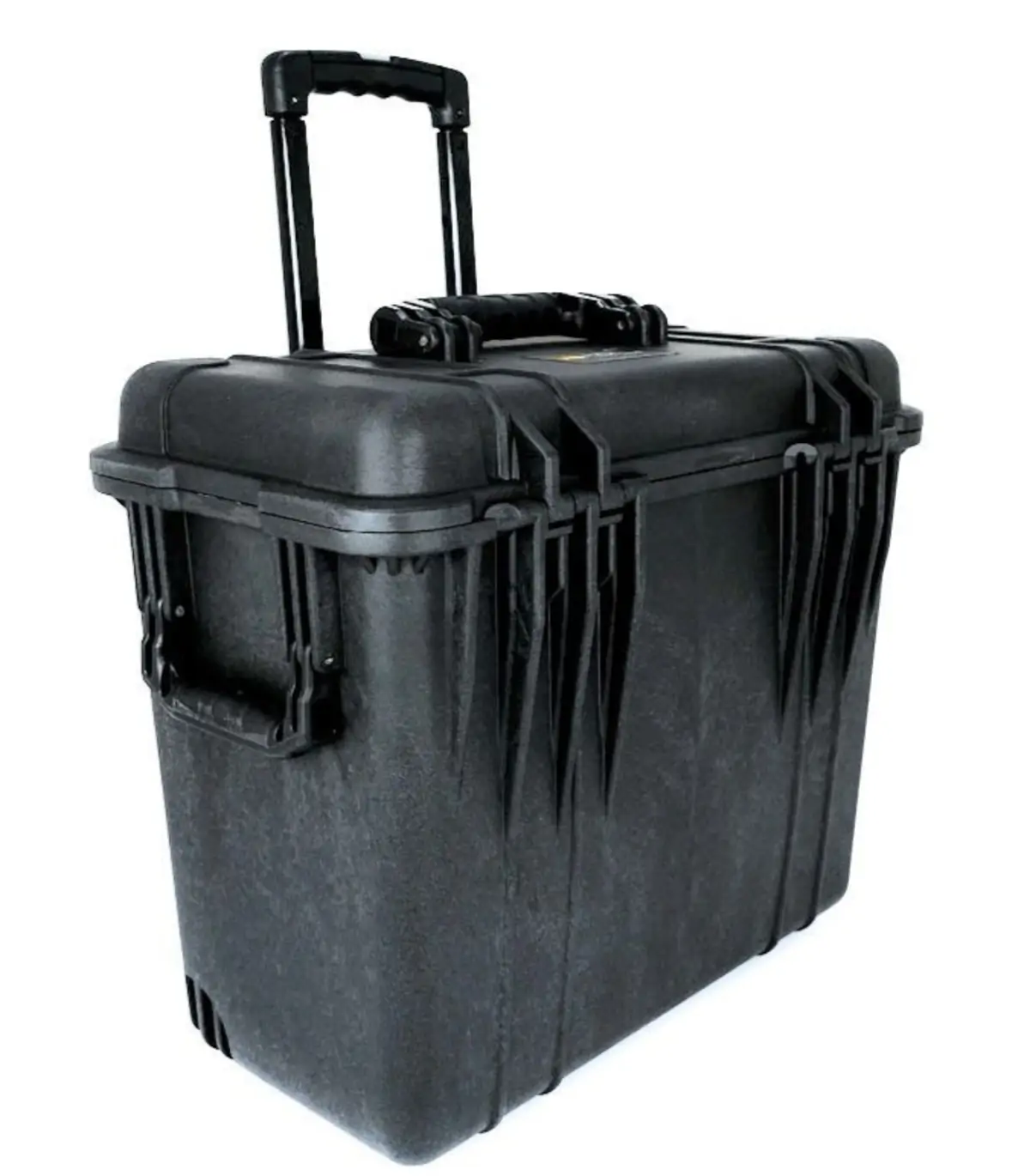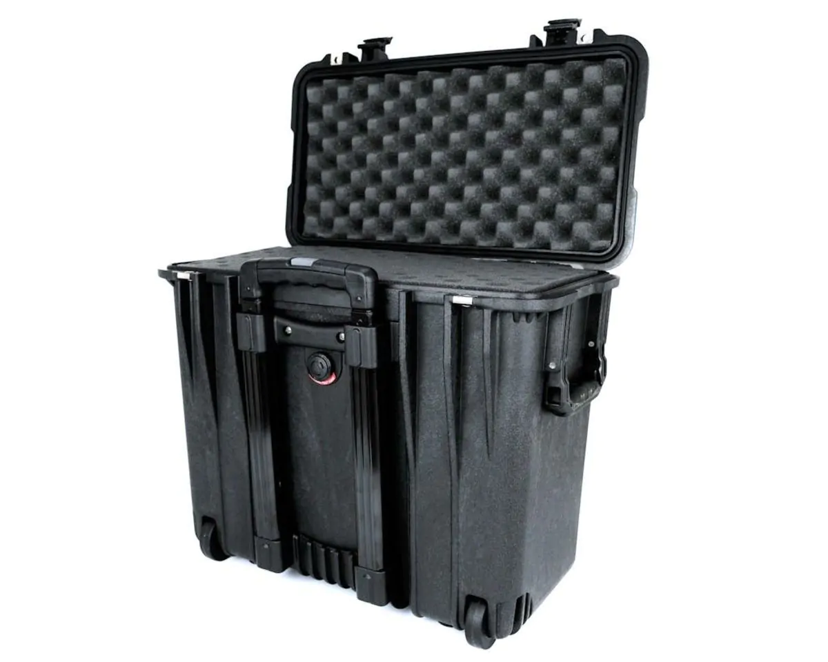 These are some of the features of this Peli 1440 case that offers total protection for your equipment. It is made of Ultra High Impact structural copolymer that makes it extremely strong and durable. Its exclusive 6.4 mm neoprene o-ring and ABS latches seal perfectly and includes an automatic purge valve for quick equalization after changes in atmospheric pressure. Your equipment can fit into the high density foam or padded dividers for total subjection and protection against impact, vibration or shock.The new Peli 1440 has a smooth rolling, quiet polyurethane wheels and an integral,retractable handle in a top-loader design that shows you everything at a glance. the interior helps safely transport anything from laptops to communication gear.As with all Peli Protector Cases, the Peli 1440 is equipped with a polymer o-ring that prevents dust and water ingress, and the Gore-Tex® pressure equalization valve prevents “vacuum-lock” so thecase opens easily.