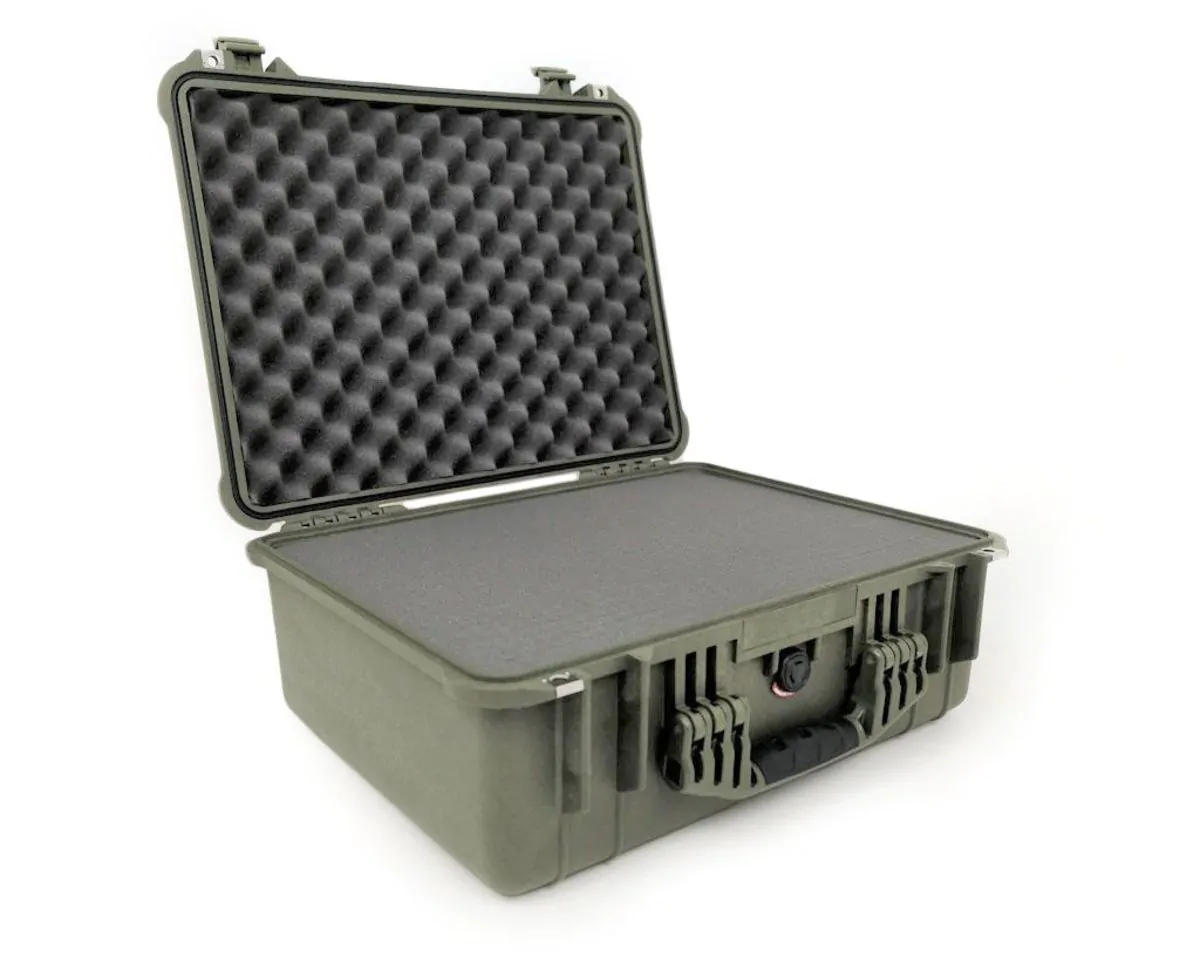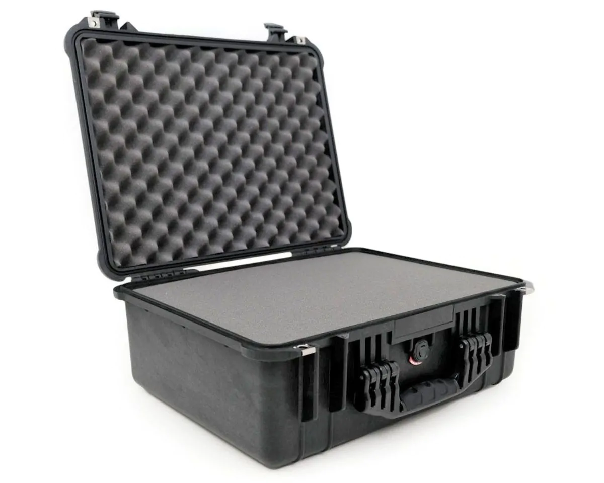 The PELI 1550 can be ordered empty, with foam, padded dividers, or TrekPak. The foam consists of one layer of corrugated lid foam, one thin base layer, and then one main layer of pick-and-pluck foam. This foam will protect your equipment against impact, vibration, shock, and drops.
