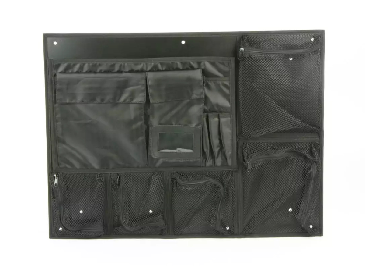 Kit includes lid organizer (5 mesh pockets, 3 pen holders, 1 business card holder, 2 sleeves with velcro flap, 1 large sleeve open top, 1 sleeve open top), 7/16" self tapping screws.