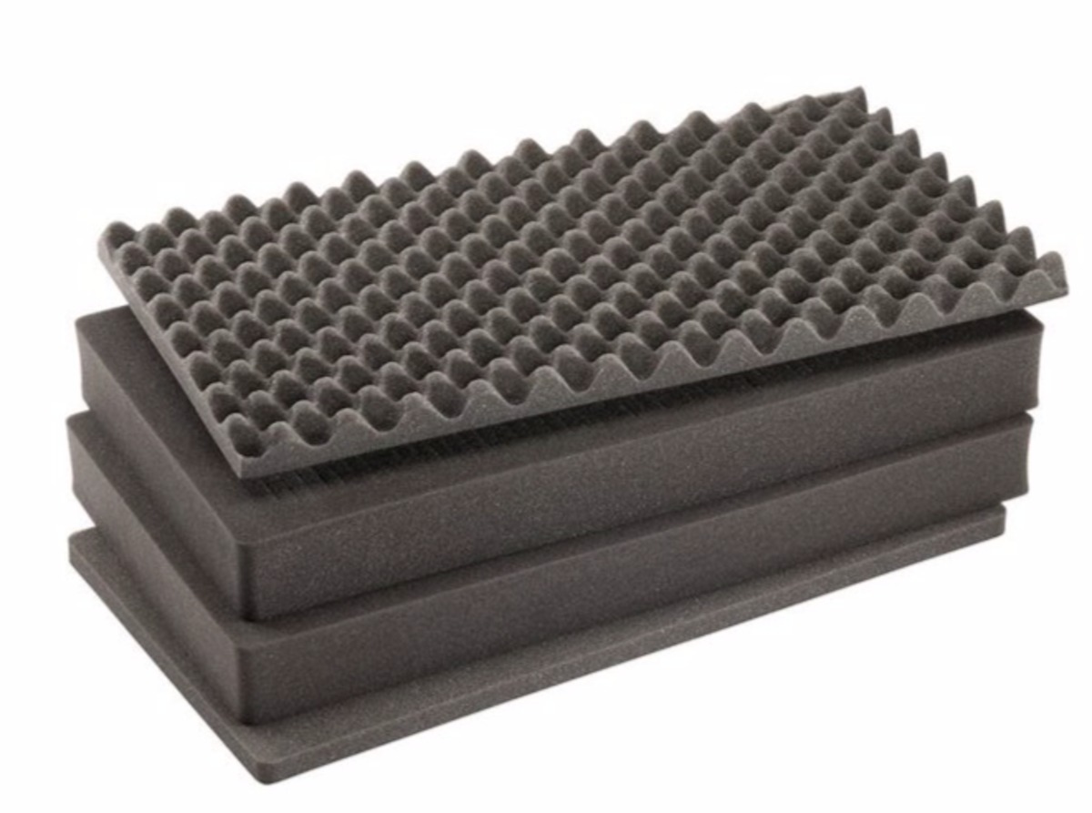 (1x) 5.2 cm Polyurethane Convolute lid foam.(3x) 6.8 cm Polyurethane Pick N Pluck (.50" x .50" squares) base foam.