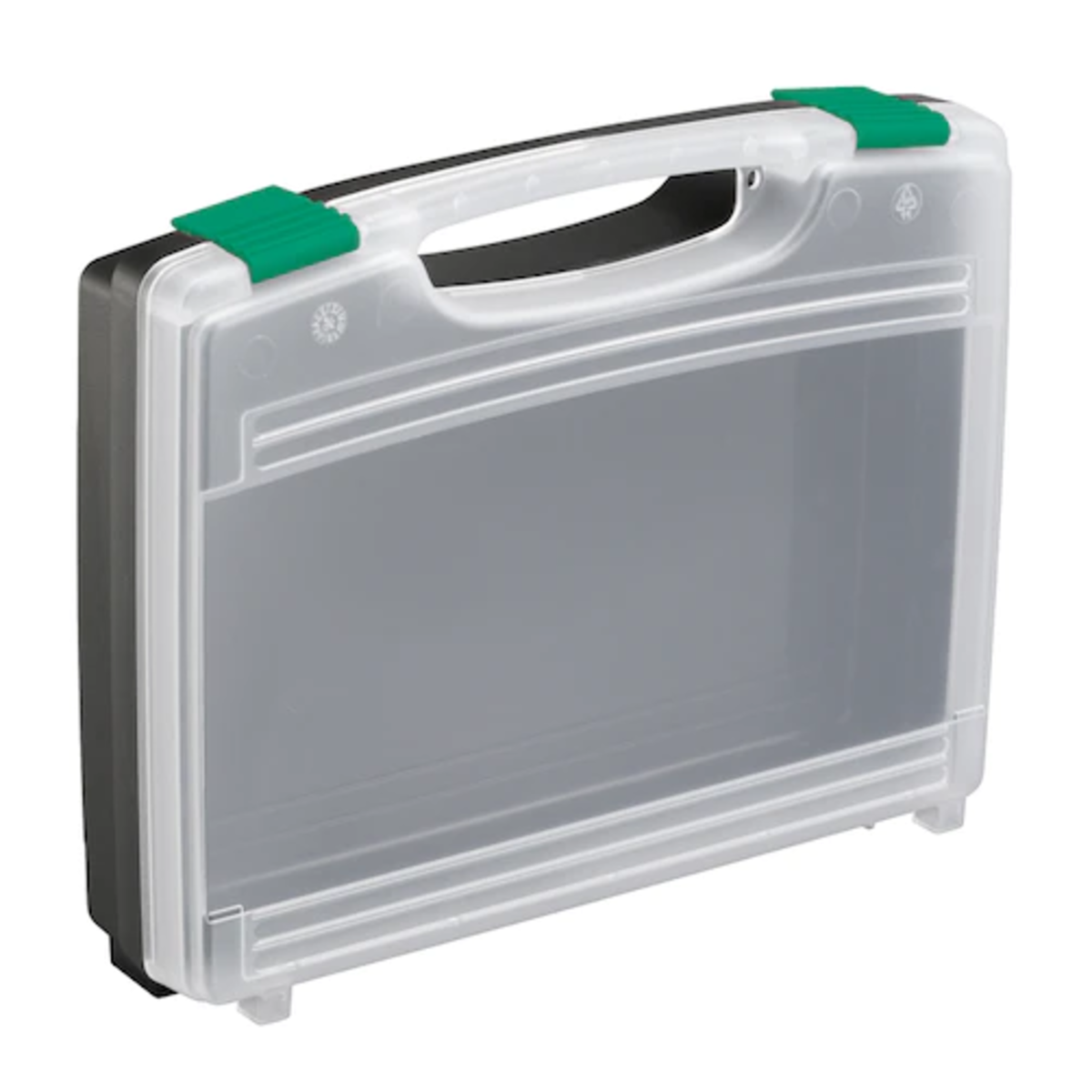 Plastic packaging Case 170/26H60 from the Advanced series with internal dimensions of 247 x 159 x 55 mm / 9.72 x 6.26 x 2.17 inch. Available with black bottom and transparent lid. Grey clips.