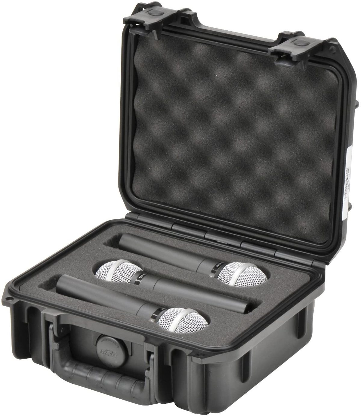 The 3i-0907-MC3 allows 3 mics to be stored horizontally. Each microphone cutout measures 1.5" wide by 6.75" long with two perforated removable foam pieces, one located on each end allowing microphone sizes up to 8.5" in length. By removing the perforated foam piece near the grill of the microphone you can change the shape from being round to square. This will accommodate other popular hand held microphones with square style grills such as the Sennheiser and Electro Voice mics. The 3I-0907-MC3 case measures 9" x 7" x 4" deep and is the most compact 3-mic case on the market. The case has convoluted foam in the lid for a compression fit and is covered by SKB's Lifetime Warranty.