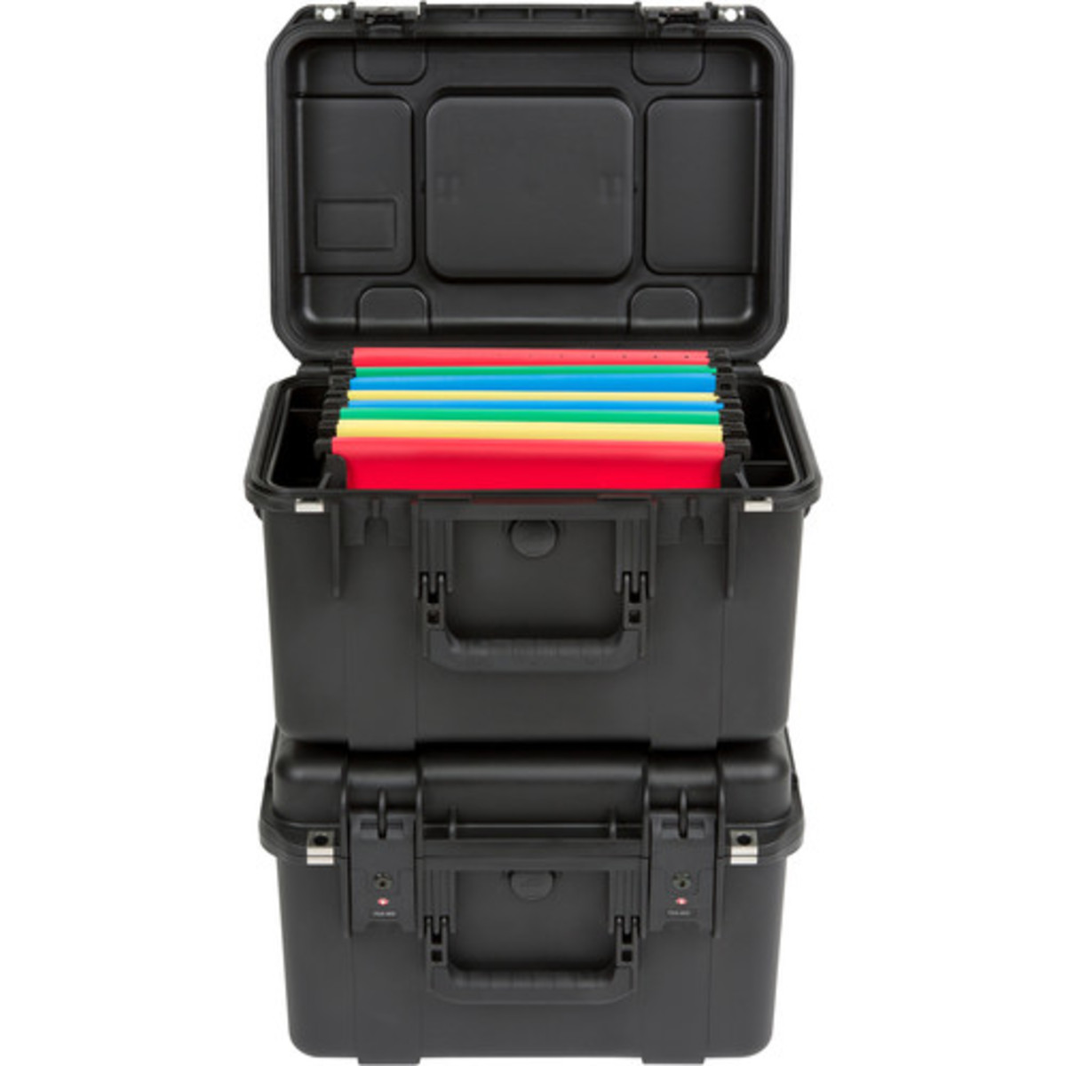 Your important documents might be protected from a fire while secured in your safe at home—but what about the water damage that frequently follows? SKB is proud to introduce the 3i-1610-10BF iSeries 1610-10 Waterproof Hanging File Case, which offers a built-in solution for documents and hanging file folders housed in our MIL-SPEC, watertight, dustproof, and virtually indestructible iSeries 1610-10 case. This case is perfect for storing important documents within your safe, as well as documents that frequently travel on the road, at construction sites, in extreme conditions for scientific research, and more.The 3i-1610-10BF features a usable hanging file area of 12” wide by 10” deep (to accommodate standard 1/2 cut tab 8.5” x 11” hanging file folders**), 1.5” wide x 2” deep accessory trays on either side for additional storage of small items, and built-in TSA-accessible locking latches.Like all SKB iSeries cases, the 3i-1610-10BF is molded of ultra high-strength polypropylene copolymer resin, and features a gasket-sealed, water- and dust- tight, submersible design (MIL-C-4150J) that is resistant to corrosion and impact damage (MIL-STD-810G). Other standard features include a molded-in hinge, patented “trigger release” latches, comfortable snap-down rubber over-molded cushion grip handle, automatic ambient pressure equalization valve (MIL-STD-648C), and resistance to UV, solvents, corrosion, and fungus. This case is also Made in the USA and comes with an Unconditional Lifetime Warranty.**Hanging file folders not included with case