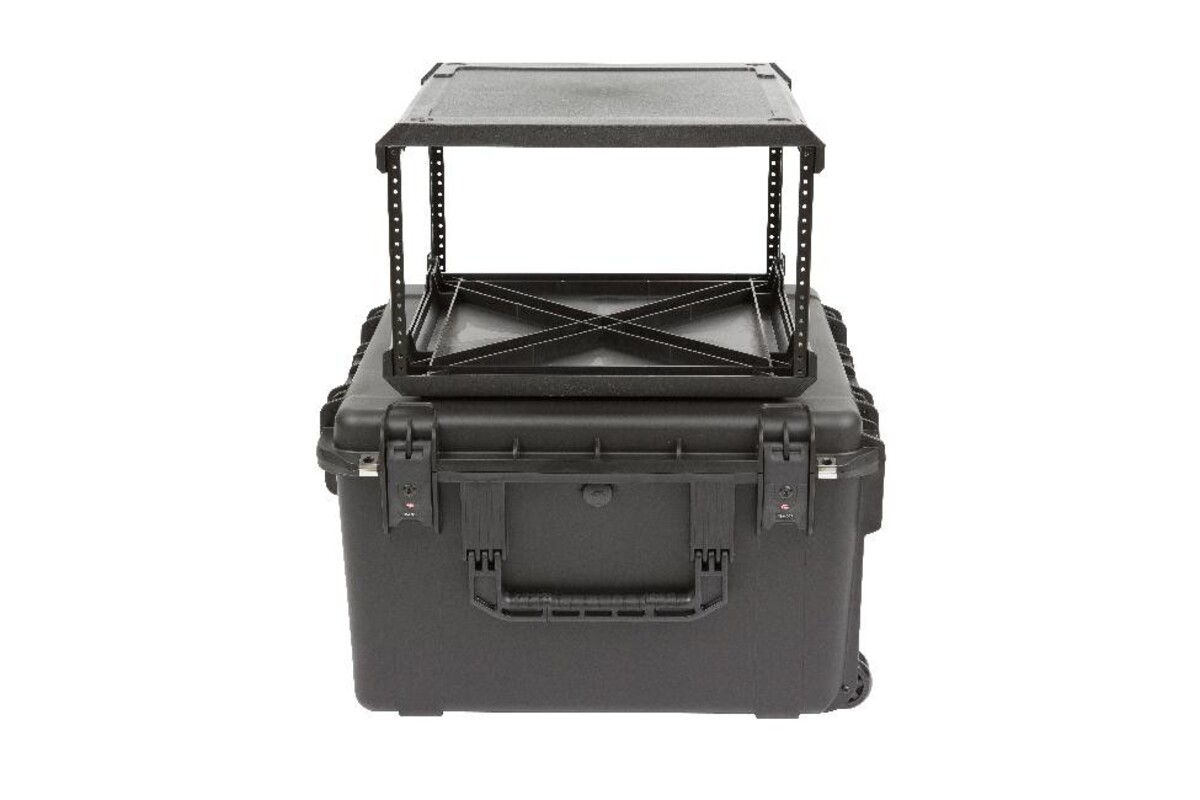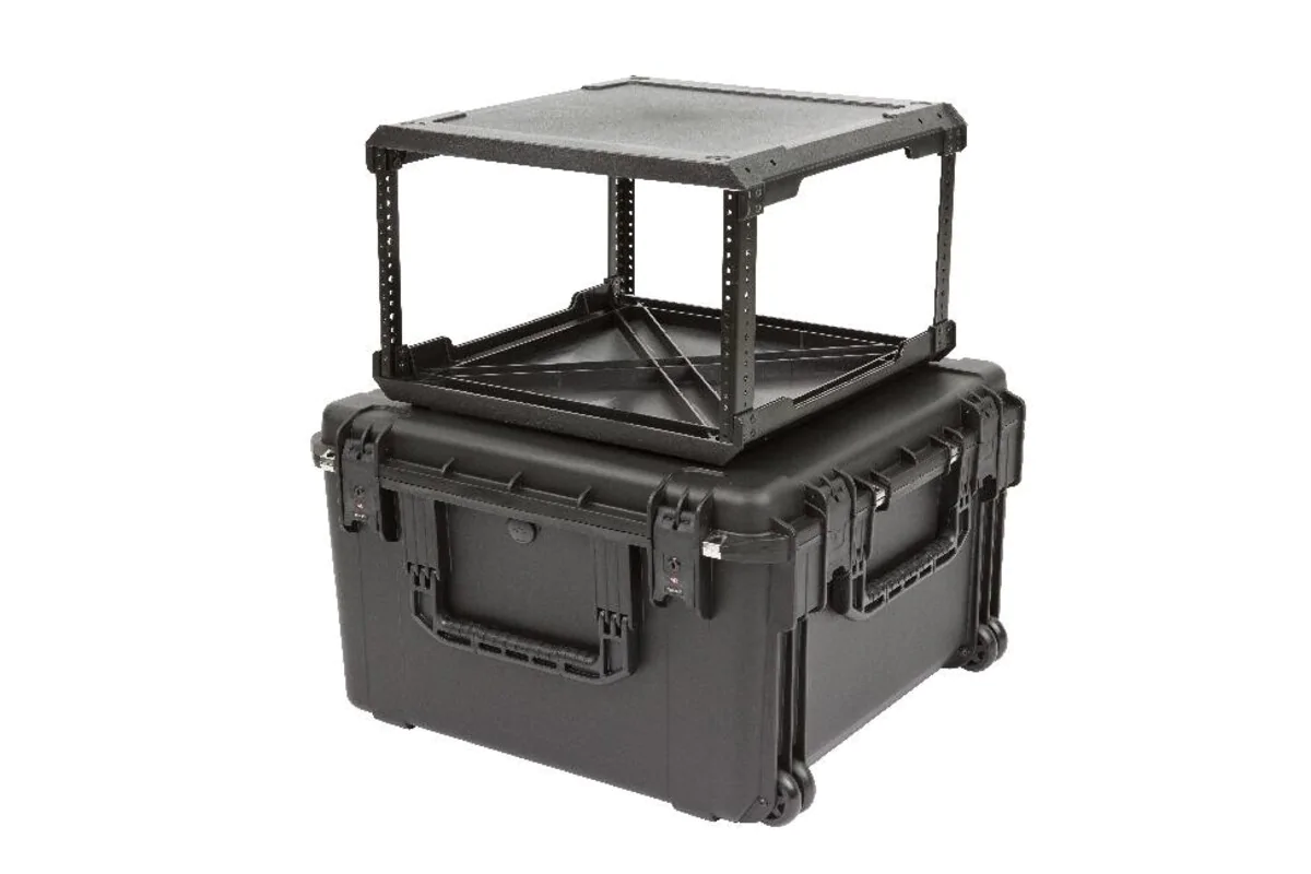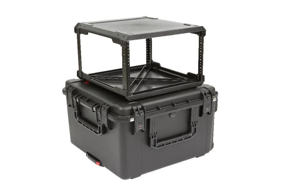 Featuring both injection molded cases and racks, our improved waterproof Fly Racks are lighter in weight and more affordable than previous models, all without compromising strength or durability.SKB's injection molded rack frames are manufactured alongside our iSeries cases in Orange, California. Rack frames are removable and fit easily into SKB's iSeries cases, where they are protected by high quality PE foam that provides space for protruding knobs and buttons.At less than half the weight of standard shock racks, SKB Fly Racks feature iSeries Watertight injection molded cases that are under 62 linear inches to keep from being oversized -- the perfect solution for flying or shipping delicate equipment. Convenient in-line wheels and a push button release pull handle provides easy transport.SKB iSeries Injection Molded Mil-Standard Waterproof Cases are molded of ultra high-strength polypropylene copolymer resin, featuring a gasket-sealed, water and dust tight, submersible design (MIL-C-4150J / IP67). Other standard features include a molded-in hinge, patented trigger release latch system, comfortable, snap-down rubber over-molded cushion grip handle, automatic ambient pressure equalization valve (MIL-STD-648C), and resistance to UV, solvents, corrosion, fungus and impact damage (MIL-STD-810G).