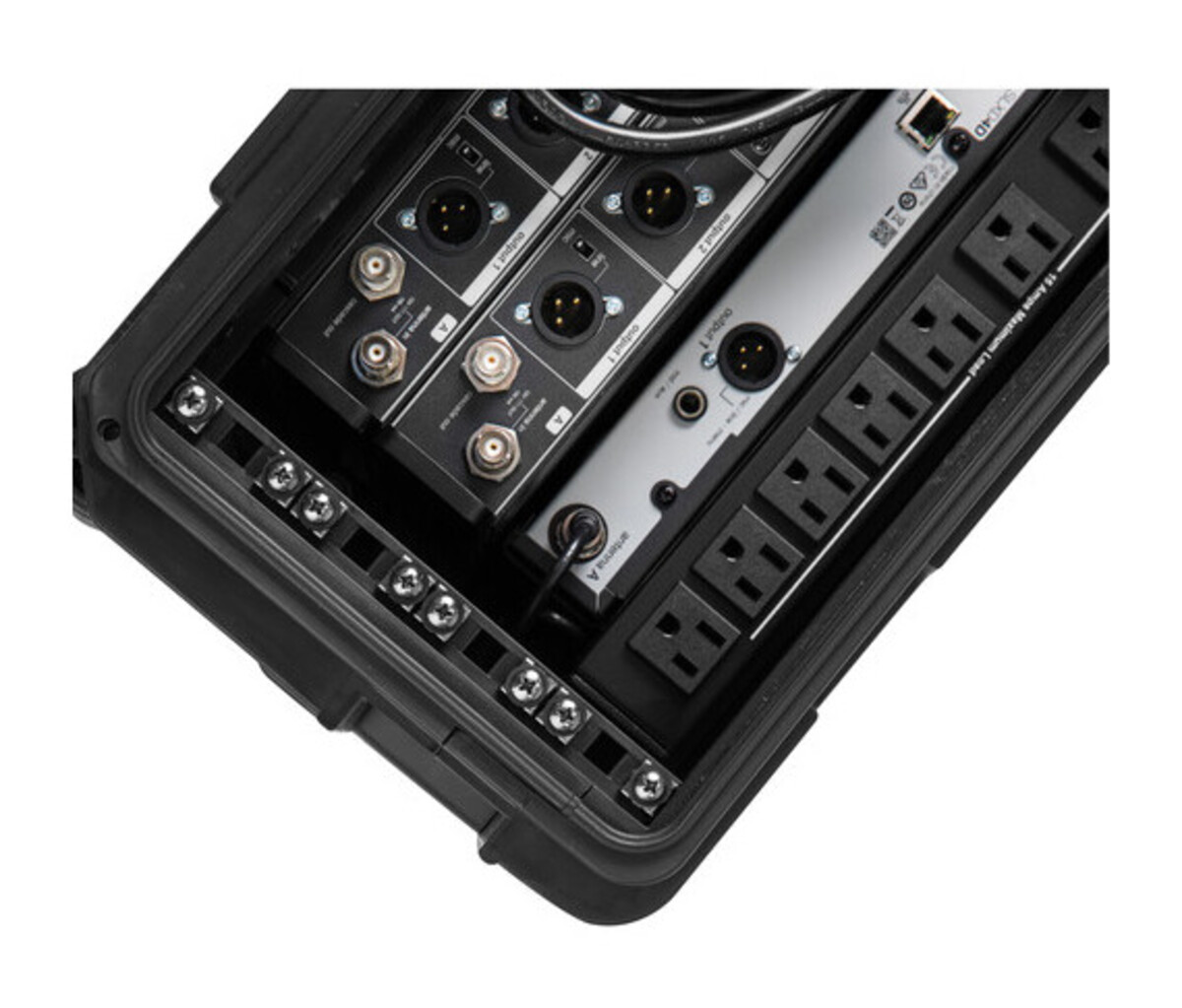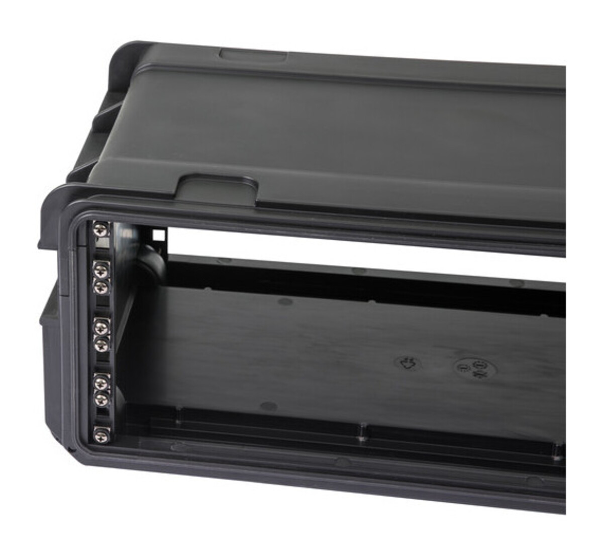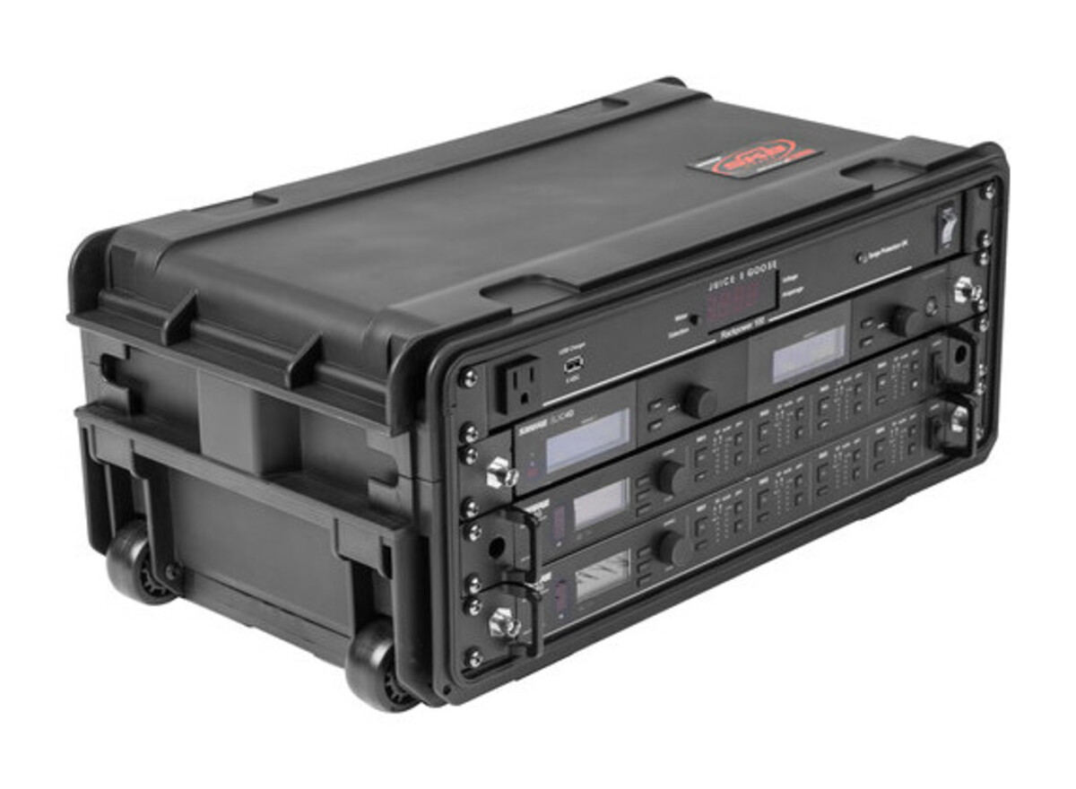 Features a 4U capacity, TSA-accessible locking latches, front and rear rack rails, gasket-sealed doors, and built-in wheels and telescoping pull handle. This case also includes a specially designed molded-in lip to protect the rack from the elements.