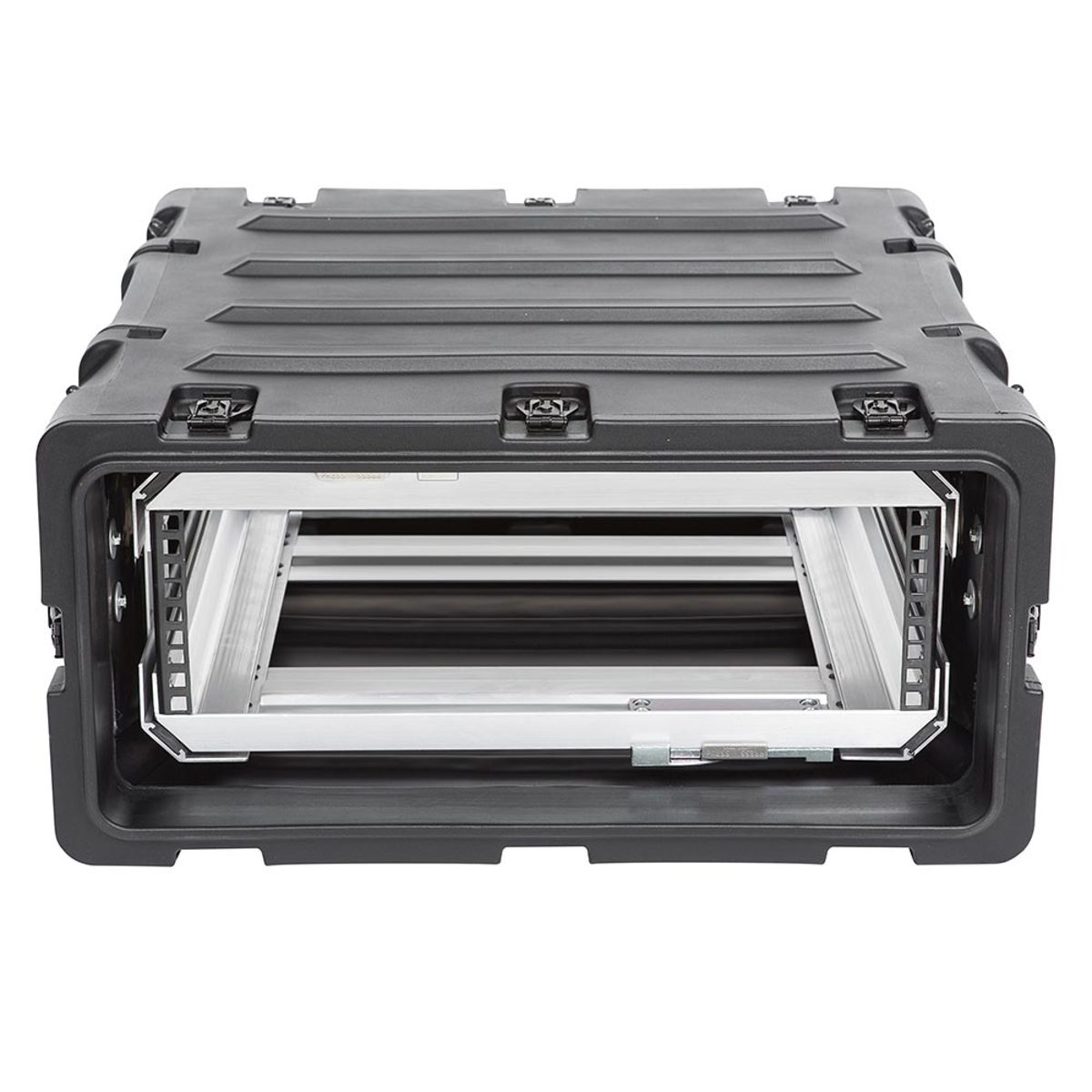 The interior of the case features a removable rack with a patent pending “positive lock” latching system that slides open like a file drawer, allowing full access to racked equipment. The interior rack is also completely removable allowing complete frame access for bench integration.