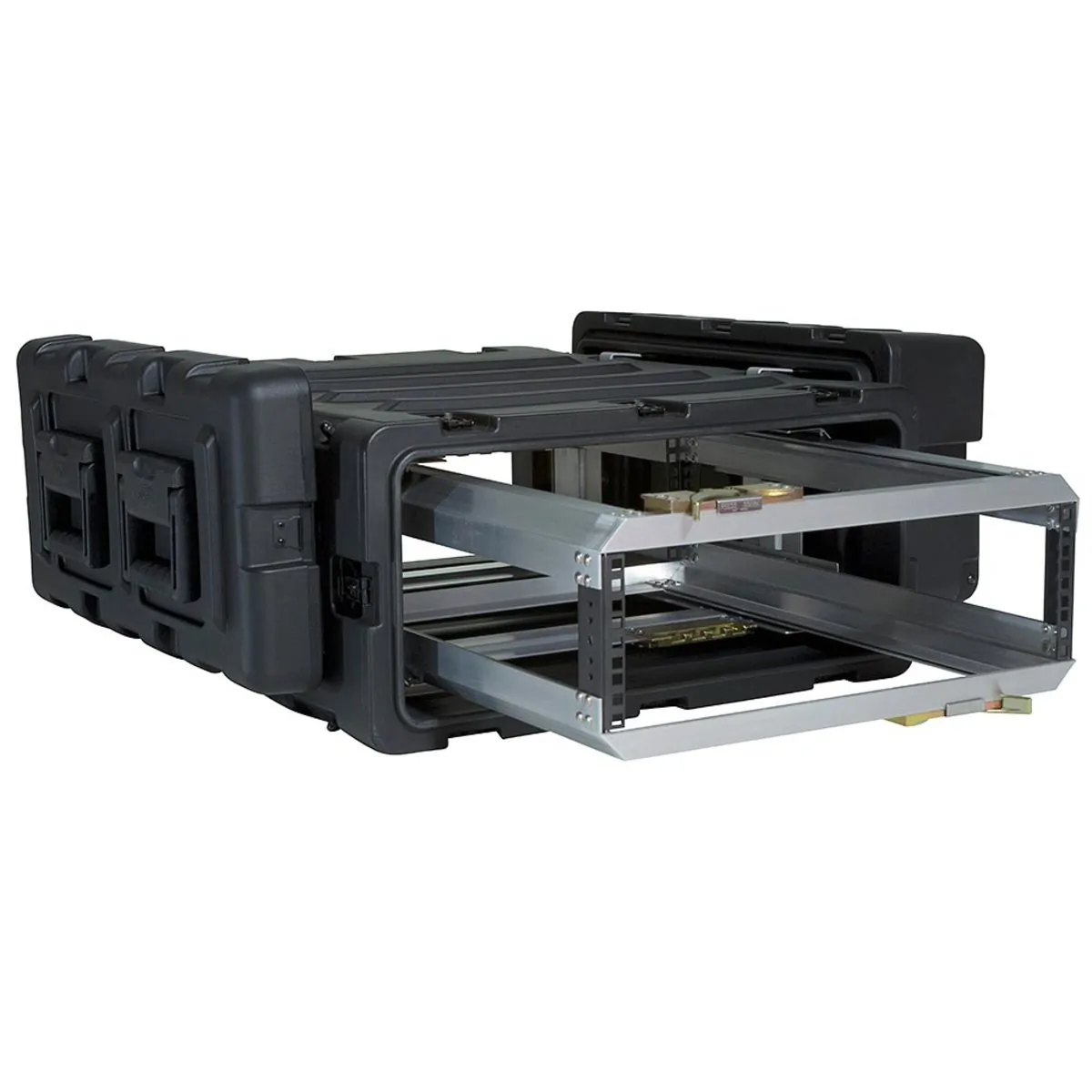 The interior of the case features a removable rack with a patent pending “positive lock” latching system that slides open like a file drawer, allowing full access to racked equipment. The interior rack is also completely removable allowing complete frame access for bench integration.