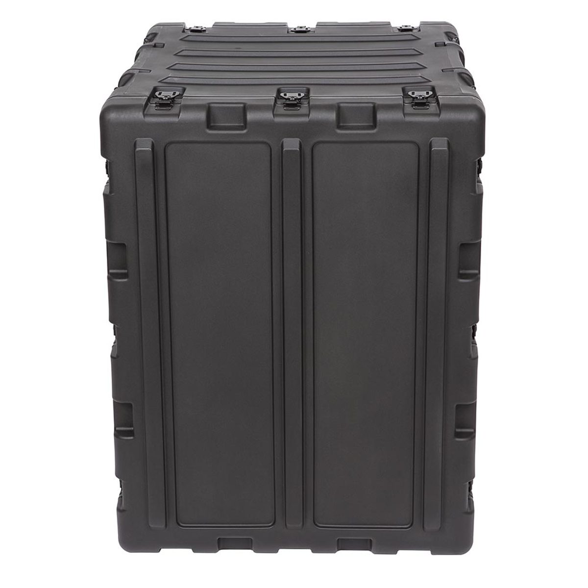 The rugged roto-molded shell ensures industry leading strength and impact resistance. The standard commercial off the shelf (COTS) case comes with 2″ deep front and rear lids to accommodate rack gear that is longer than 20″. Molded-in stacking ribs and lugs are designed to stack with all SKB 3RR and 3RS cases, as well as competitive manufacturer cases, and feature black powder coated stainless steel hardware that is recessed for protection and 4 comfort grip spring loaded lift handles which allow for easy movement. An automatic pressure relief valve is another standard feature along with gasket sealed lids that include convenient lid hangers to store your lids when your equipment is in operation. Coupling straps are included for securing the racks together when stacked.