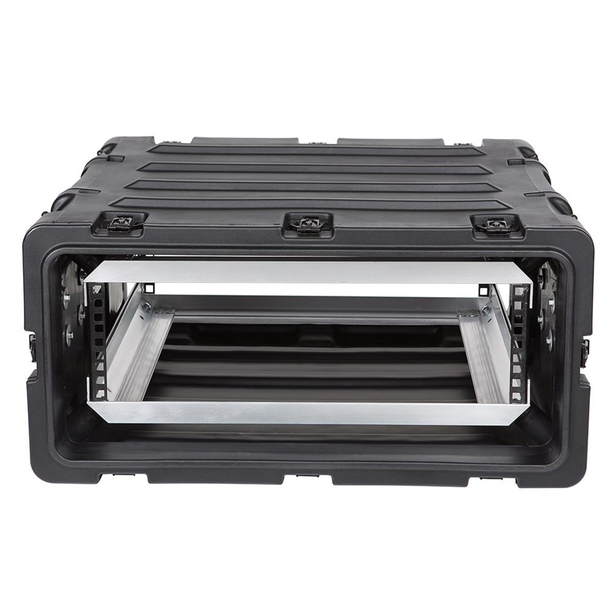 The rugged roto-molded shell ensures industry leading strength and impact resistance. The standard commercial off the shelf (COTS) case comes with 2″ deep front and rear lids to accommodate rack gear that is longer than 20″. Molded-in stacking ribs and lugs are designed to stack with all SKB 3RR and 3RS cases, as well as competitive manufacturer cases, and feature black powder coated stainless steel hardware that is recessed for protection and 4 comfort grip spring loaded lift handles which allow for easy movement. An automatic pressure relief valve is another standard feature along with gasket sealed lids that include convenient lid hangers to store your lids when your equipment is in operation. Coupling straps are included for securing the racks together when stacked.