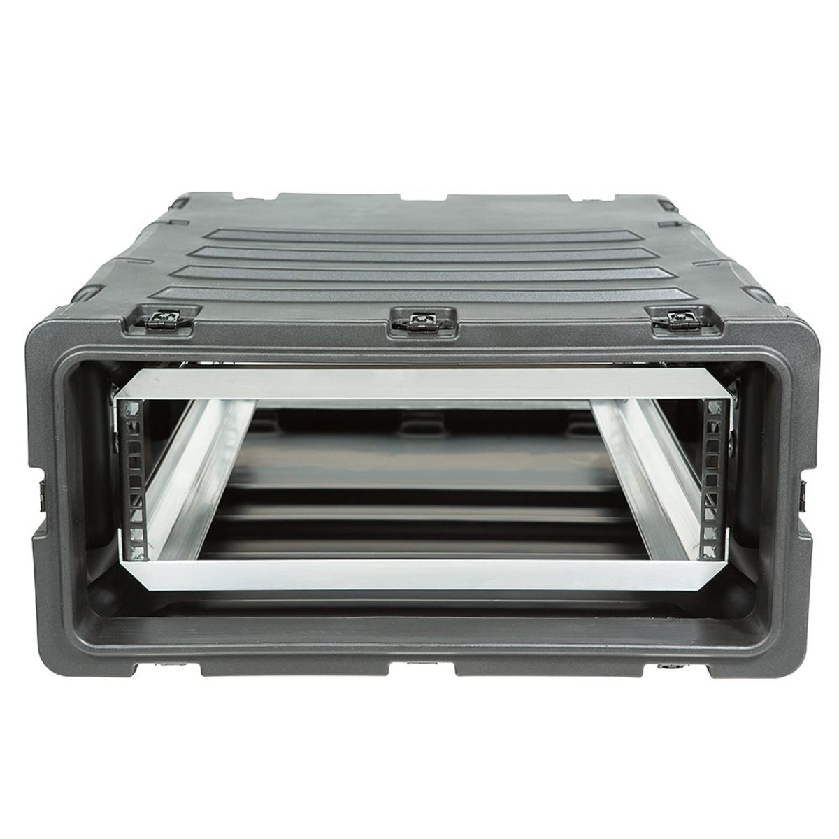 Molded of LMDP Linear Medium Density Polyethylene plastic that meets or exceed MIL-STD 810G standards. The rugged roto-molded shell ensures industry leading strength and impact resistance. The standard COTS (commercial off the shelf) case comes with a 2” deep front lid and a 5” deep rear lid to accommodate rack gear that is longer than 30”, and edge casters to allow convenient case transport. Molded-in stacking ribs and lugs are designed to stack with competitive manufacturers cases. Black powder coated stainless steel hardware are recessed for protection is standard as well as 8 comfort grip spring loaded lift handles which allow for easy movement. An automatic pressure relief valve is another standard feature along with gasket sealed lids that include convenient lid hangers to store your lids when your equipment is in operation. Coupling straps are included for securing the racks together when stacked.