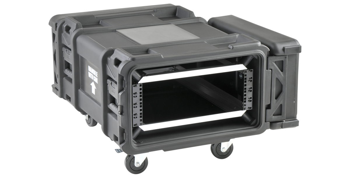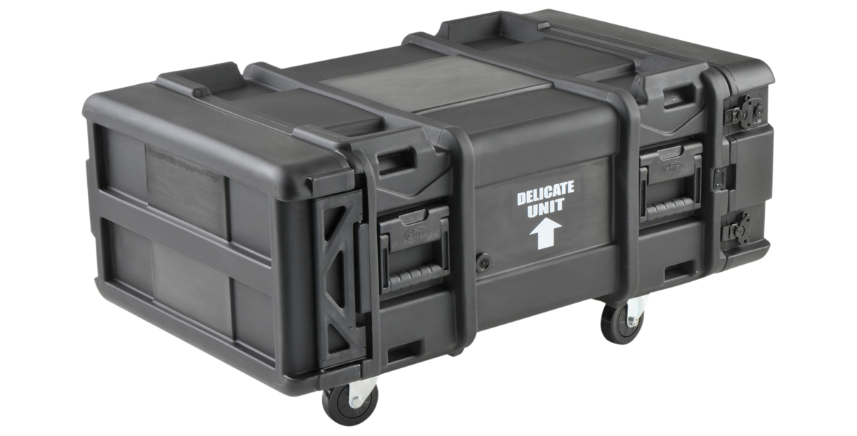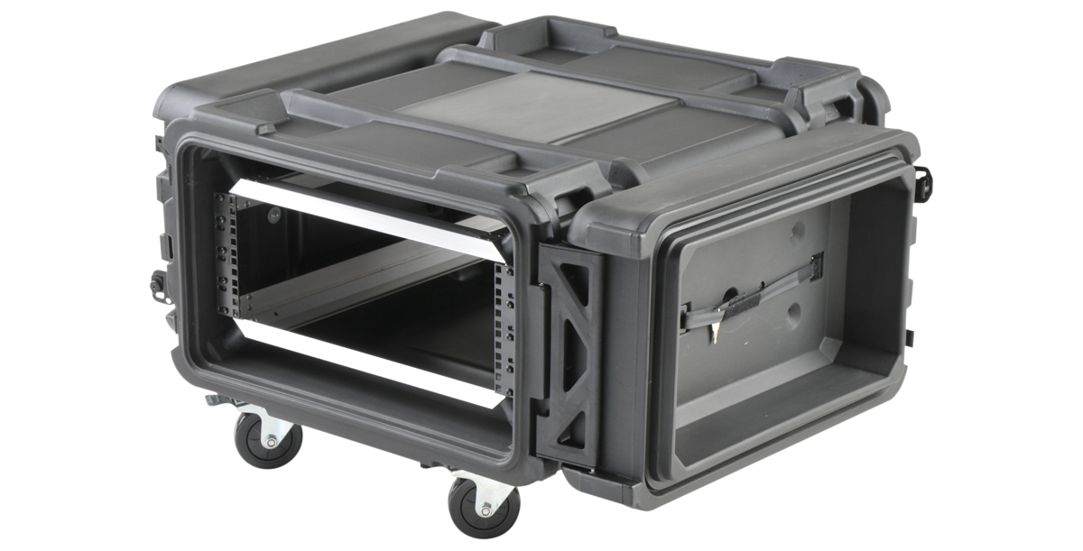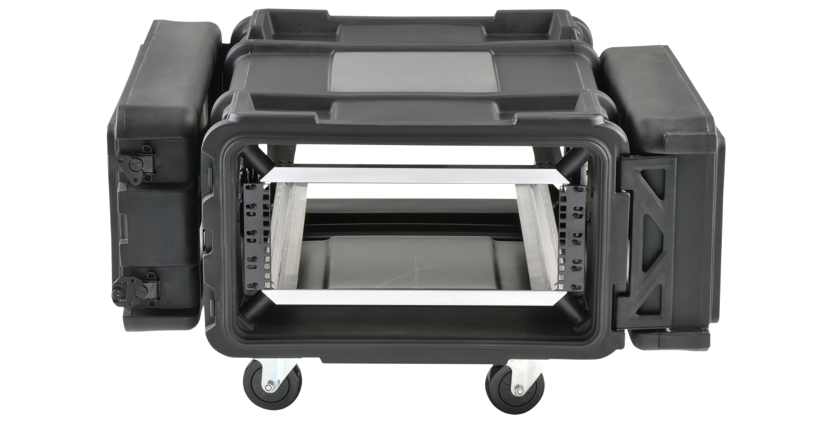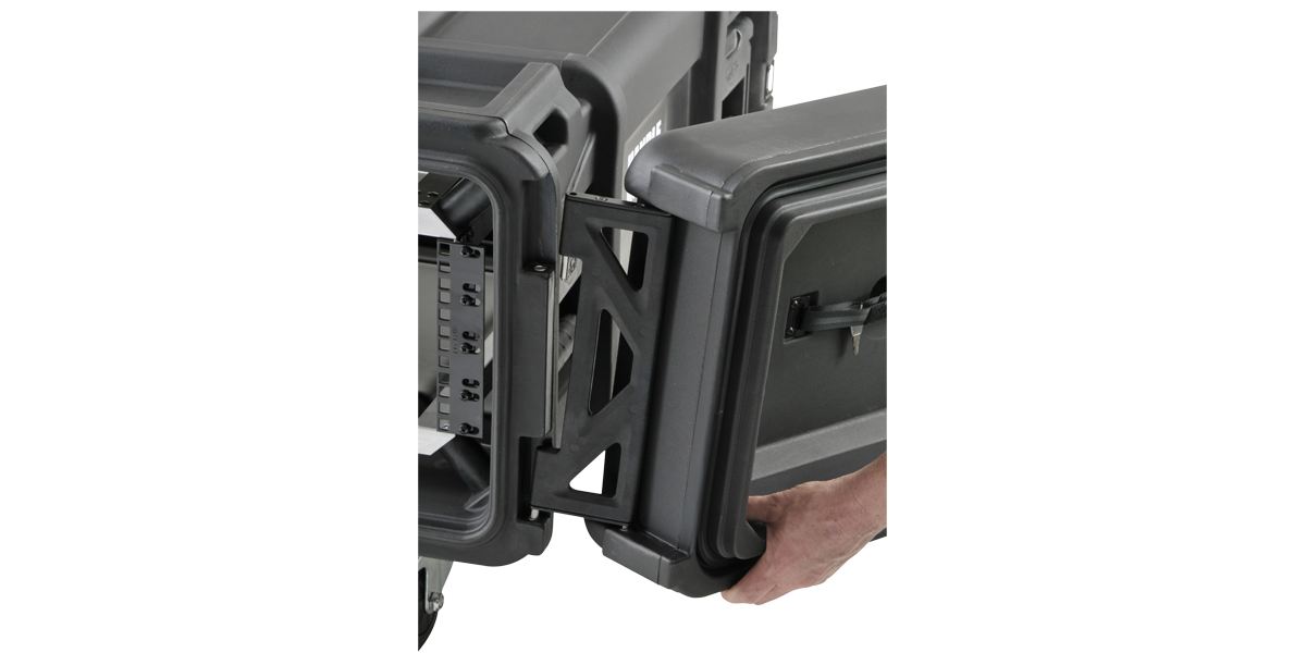 Both front and rear lids are designed to protrude into the base of the case approximately 1" with a unique double wall structure that makes them incredibly rigid where this intersection occurs, providing MIL-SPEC sealing characteristics with significantly fewer latches than most competitive cases. This revolutionary design allows for rapid deployment in an up-right configuration, even when stacked -- 3SKB Roto Shock Racks are the only shock racks in the marketplace today that will open front and back while stacked.