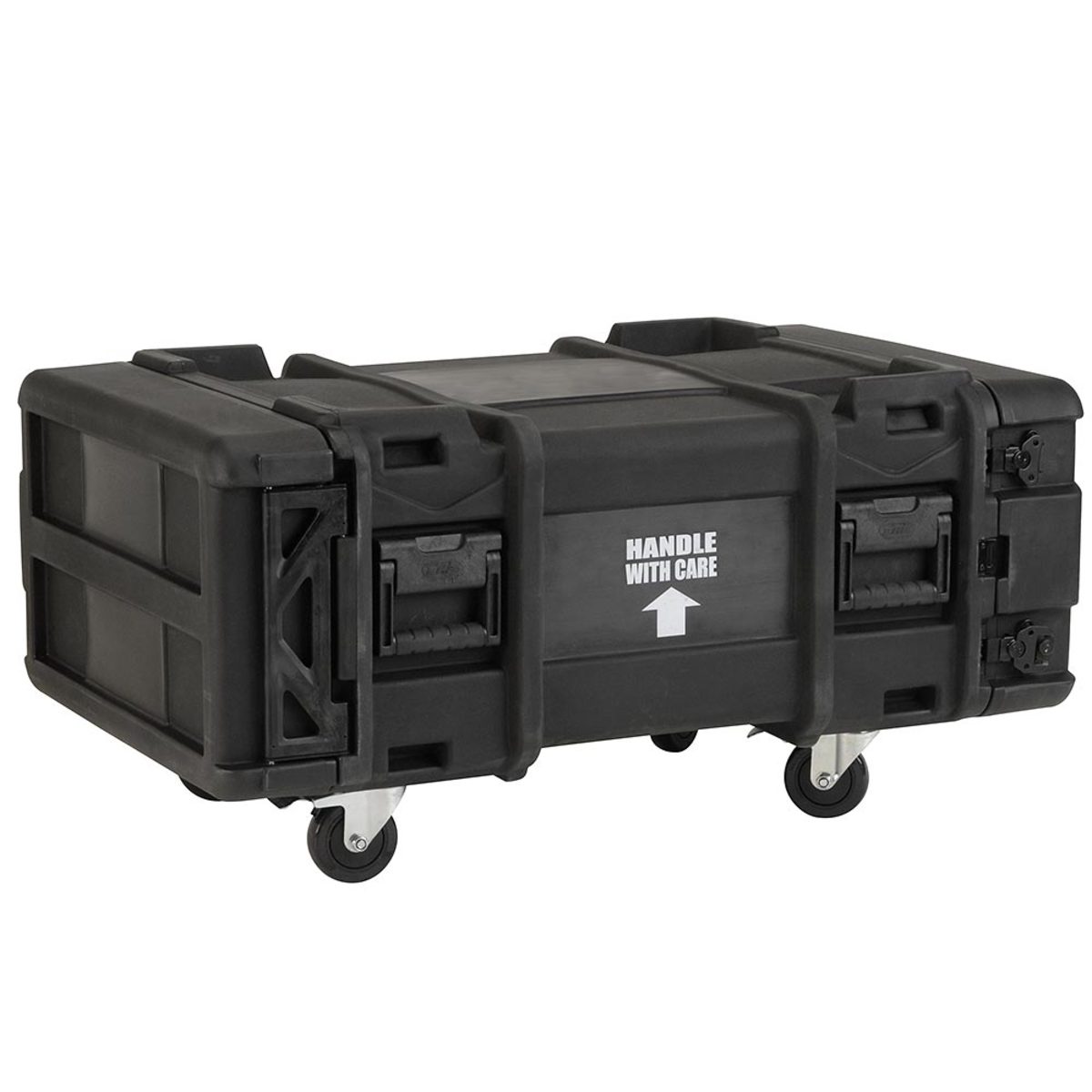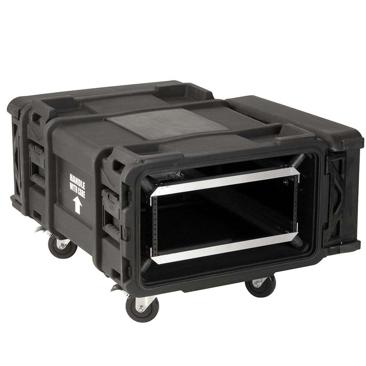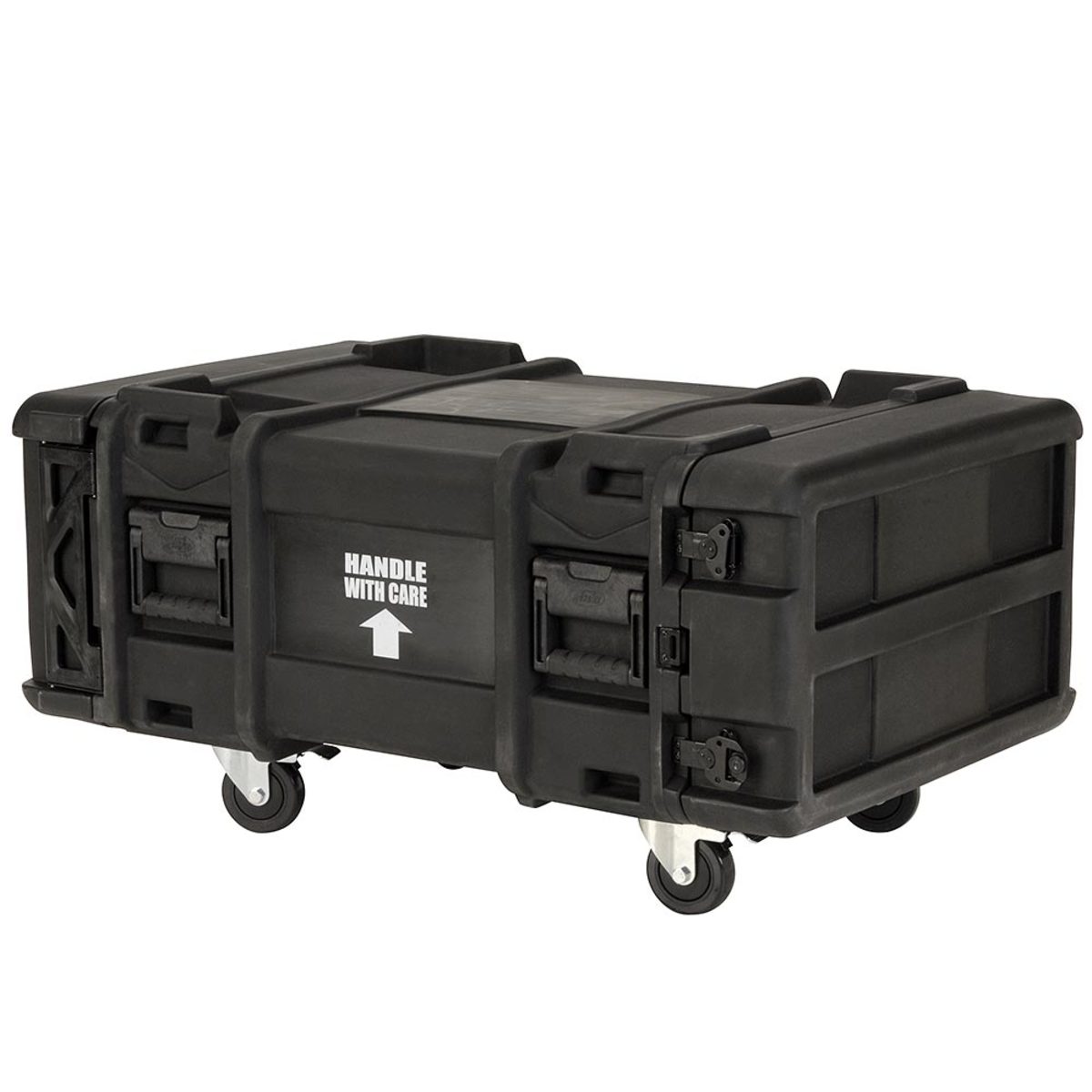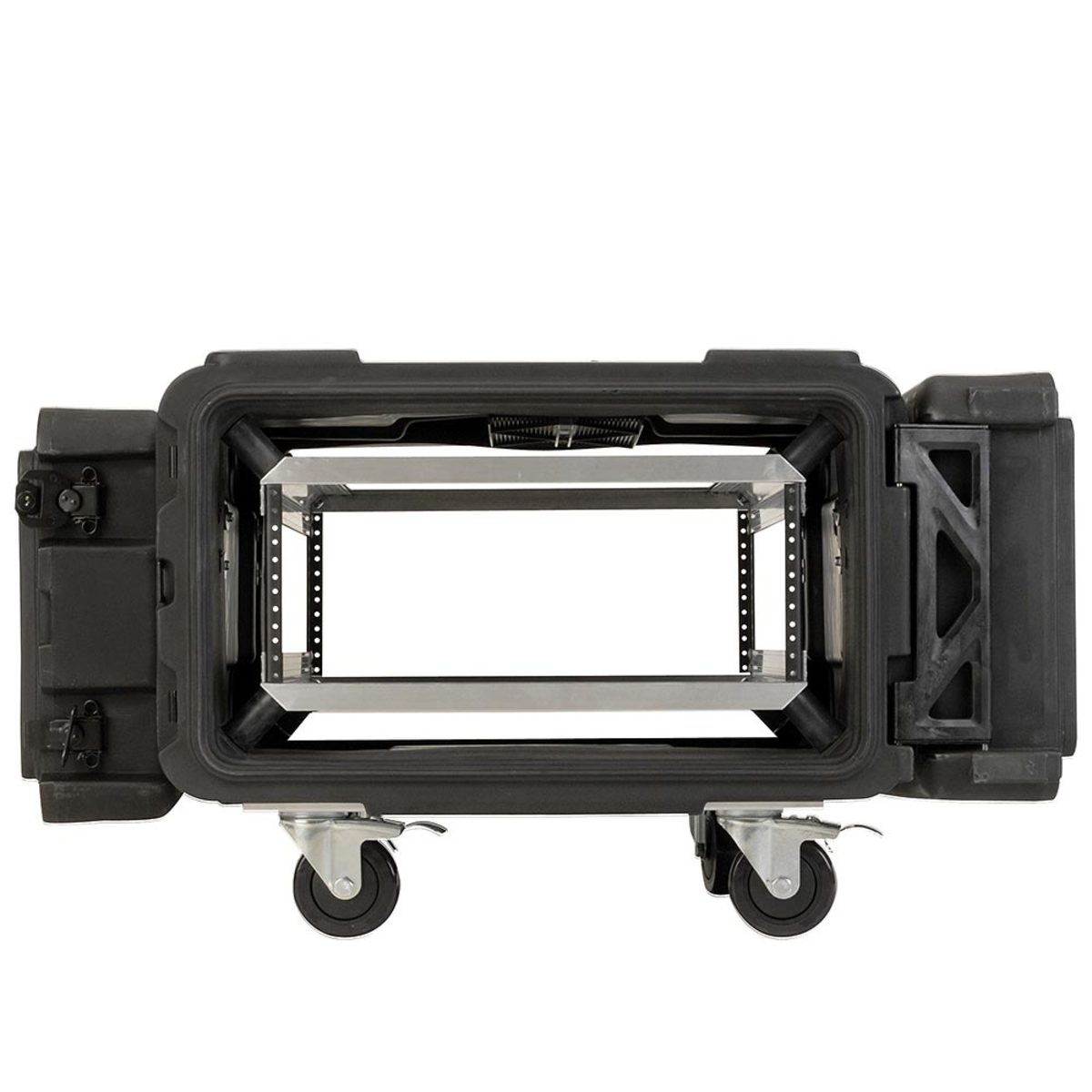 This case has all of the same great features as the 24″ (610mm) deep Roto Shock Series. Standard features include: (patent pending) compound hinged doors, black powder coated stainless steel latches, removable 4″ casters. The inner rack chassis is built of high strength / lightweight aluminium alloy and 11 gauge hot rolled carbon steel rack rails to DIA-310 standards