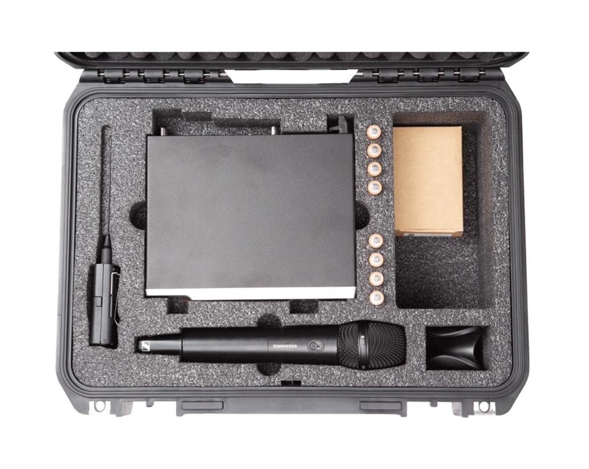 The 3i-1711-SEN case fits the Sennheiser EW-D, EW-DX, EW100, EW300, and EW500 Series Wireless Microphone Systems. The custom cut PE interior foam is designed to securely transport the entire Sennheiser EW Wireless Microphone package including the receiver, antennas, handheld mic transmitter, body pack transmitter, lavalier microphone, mic clip, power supply, spare AA batteries, and other additional accessories. This case will also fit the Sennheiser IEM transmitters and receivers.